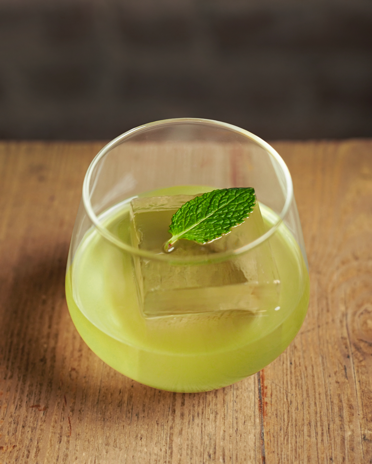 Premium soju cocktail with green tea, lime syrup, mint, sparkling water and dried flower