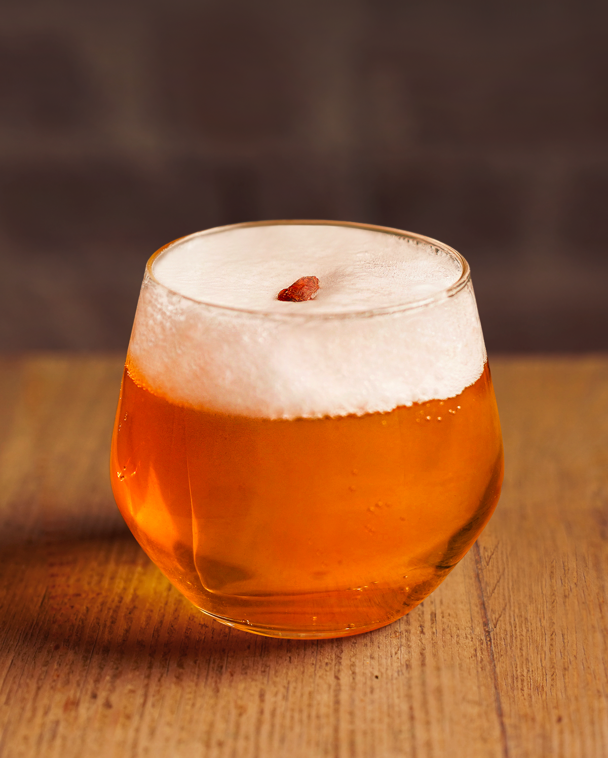 Goji berry and cacao nib infused premium soju, finished with pine needle camellia wine foam (Non Vegan Gelatin foam)